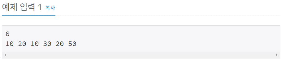 문제에서 보았듯이, {10, 20, 10, 30, 20, 50} 이 있다면 {10, 20, 30, 50}이 정답이라고 볼 수 있다.
