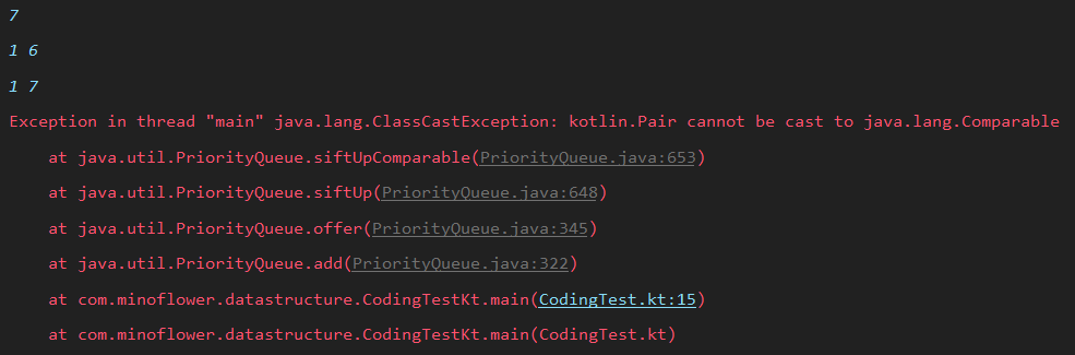 ClassCastException의 일종으로, Pair 클래스는 Comparable로 캐스트될 수 없다는 오류 메시지가 뜬다.