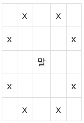 동물원에서 막 탈출한 원숭이 한 마리가 세상구경을 하고 있다. 그 녀석은 말(Horse)이 되기를 간절히 원했다. 그래서 그는 말의 움직임을 유심히 살펴보고 그대로 따라 하기로 하였다. 말은 말이다. 말은 격자판에서 체스의 나이트와 같은 이동방식을 가진다. 다음 그림에 말의 이동방법이 나타나있다. x표시한 곳으로 말이 갈 수 있다는 뜻이다. 참고로 말은 장애물을 뛰어넘을 수 있다.